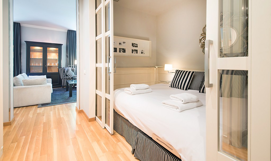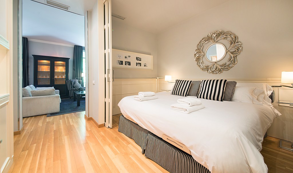 Our guests in this apartment enjoy a spacious living room with a white sofa, 2 classy arm chairs and a glass dining table with 6 chairs, a 55” smart TV and DVD player. From the living room there is access to two balconies from where one can overview the street down to the corner of Rambla de Catalunya. There is a lot of natural light coming through two big windows. The bedroom comes with a king size bed and with a mattress of highest quality. In front of the bed, in the white cupboard there is the second TV (30”) for guests who enjoy watching TV from the bed.
