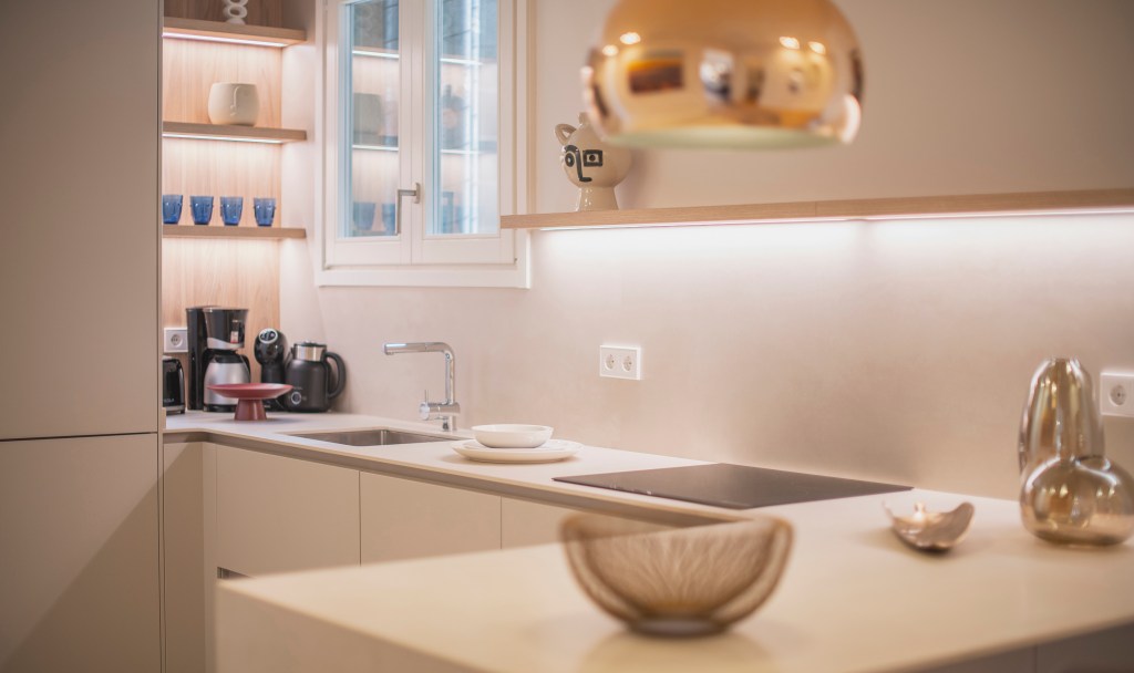 Every detail of **Suite Alba** exudes sophistication. The spacious living and dining area, adorned with handpicked designer pieces, flows seamlessly into an open-concept kitchen. This culinary space is outfitted with high-end appliances and finished to the highest standards, making it as functional as it is stylish. The suite’s south-facing orientation bathes the interiors in natural light throughout the day, enhancing the warmth of the rich wooden floors and illuminating the carefully curated décor.