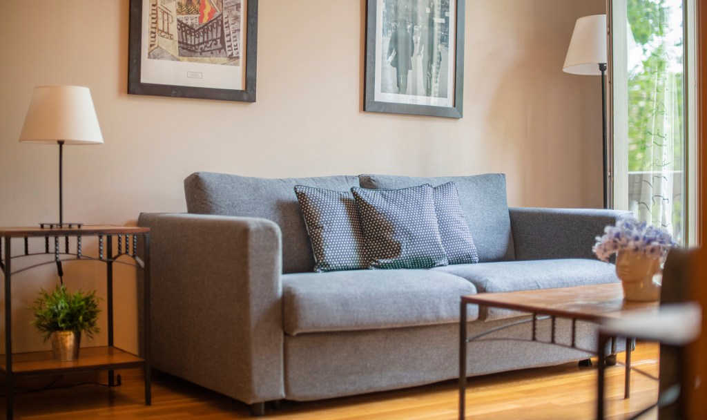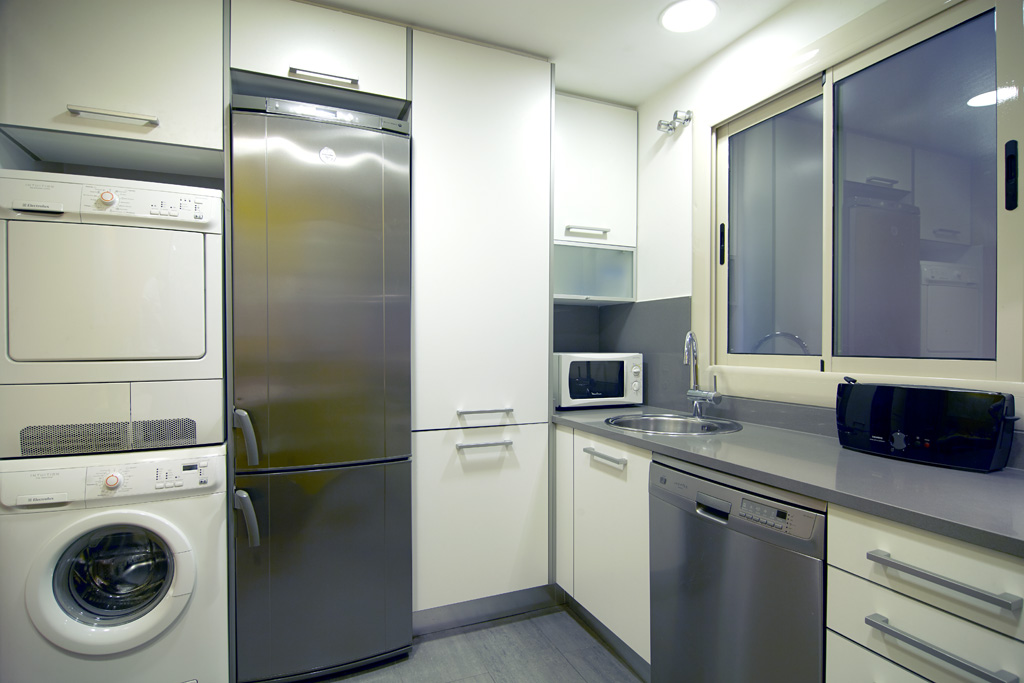 The living room of this apartment is spacious, faces Passeig de Gracia and even has a balcony from where the visitor can overview the avenue down to Placa de Catalunya. Further on the living room is equipped with two comfortable sofas, a big flat-screen TV and a DVD player. One of the two sofas converts in one easy movement into a comfortable double bed. Also in the living room, there is a desk with a chair which comes in handy in case some work needs to be done.