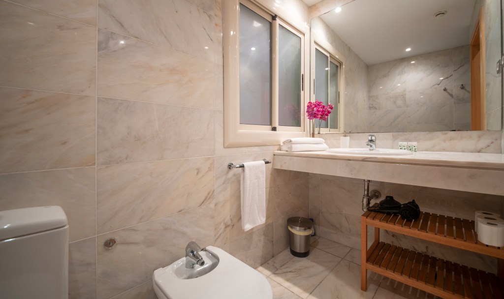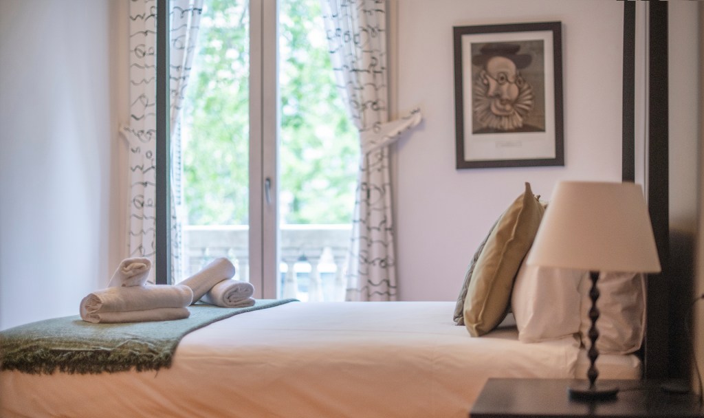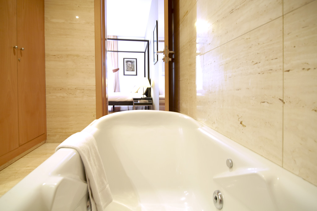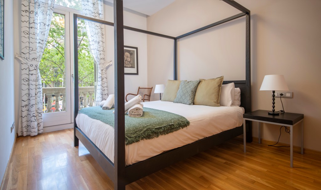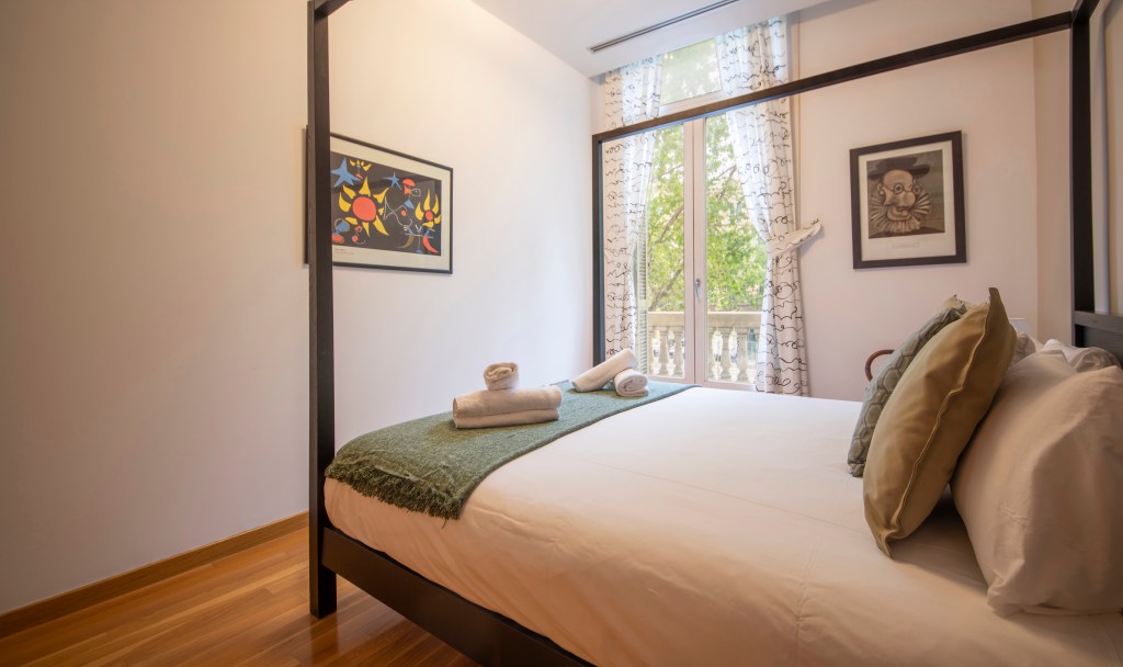 The master suite has a queen-sized canopy bed and a large cupboard. The guests have access to the balcony with views of the Paseo de Gracia. The ensuite bathroom, with a jacuzzi-style tub and shower, also comes with double sinks, WC and bidet.