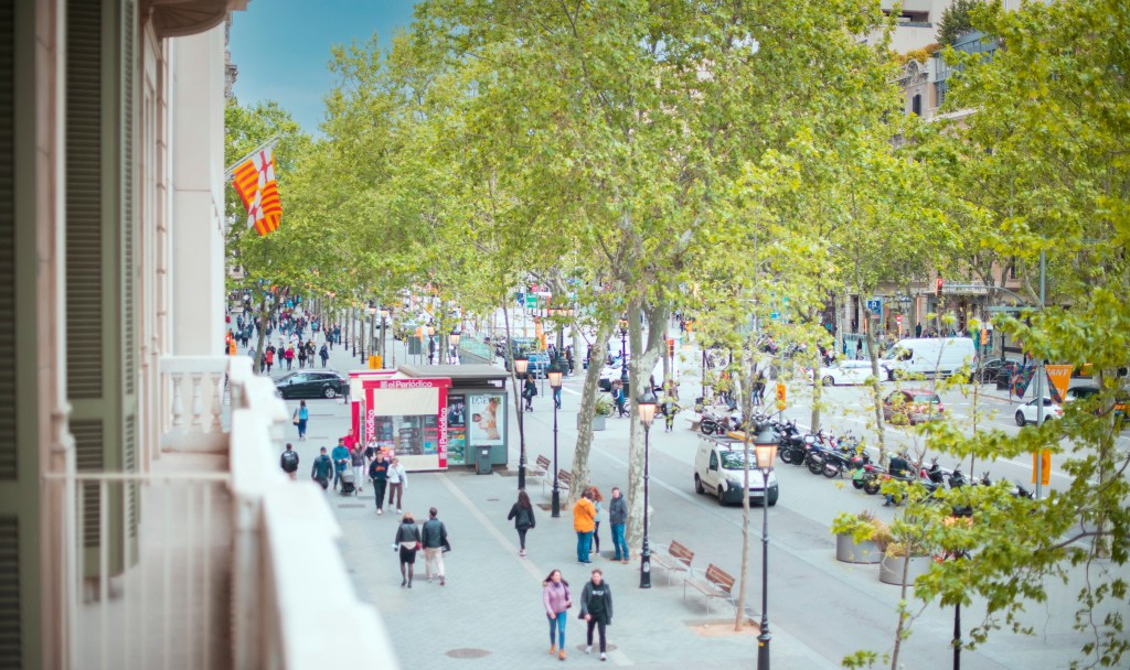 The apartment is surrounding by fabulous shops, great restaurants and good grocery stores. One of Gaudi’s commissioned house is one block from the apartment. The apartment itself is lovely, it has huge windows in the living room and the bedroom. They look right out on the Main Street. There is a beautiful tree in front of the window that glimmers in the afternoon sunlight. It doesn’t block the view but it does provide a little privacy.