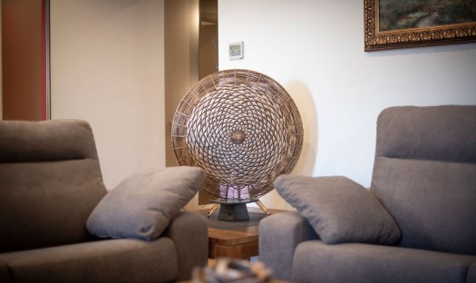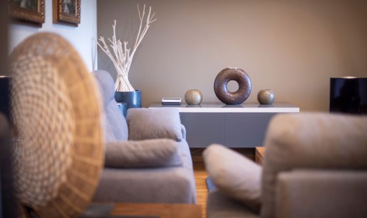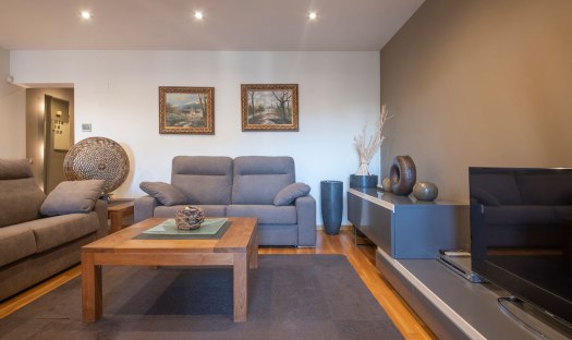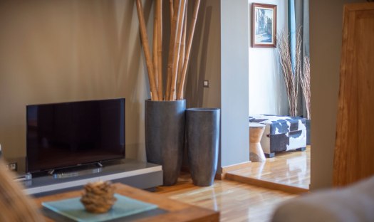 The living room is spacious and comes with 2 sofas and one converts into a bed for the 5th and 6th guests. The 55″ smart TV is hooked up to a strong WiFi connection. From the living room, guests have access to the south-facing gallery which has a large window front and a dining table with 6 chairs.